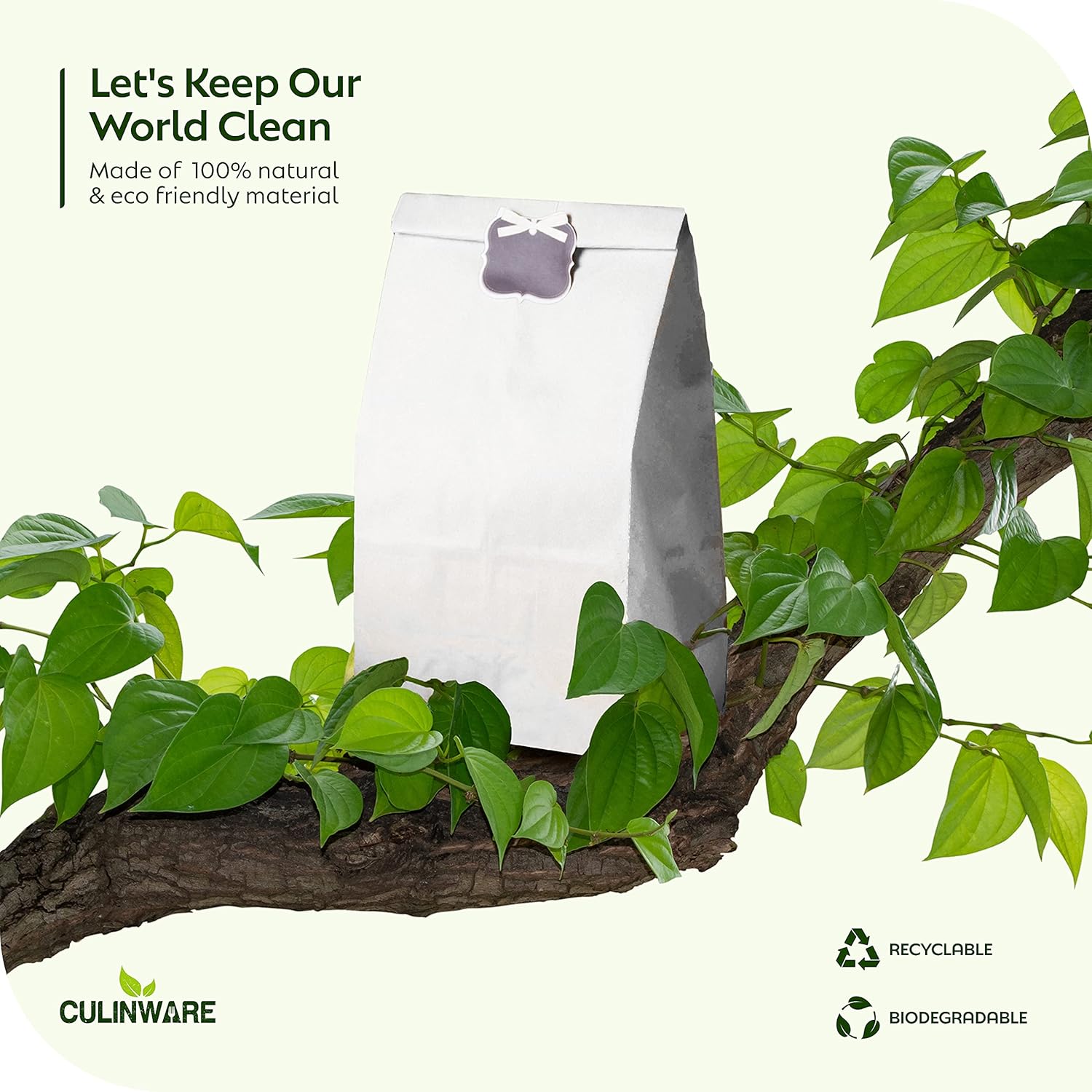 Culinware Kraft White Paper Bags for Lunch and Food Storage is very useful and multi-purpose.Bakeries, Restaurants, Cafes and Takeout - use them to pack up their customers treats. These paper bags are durable and free standing so you can easily and quickly pack up the customer’s order and avoid extra wait time. These paper bags are great cookie bags, pastry bags, sandwich bags, lunch bags, bakery treat bags, bread bags and popcorn bags. As an extra perk benefit from the clean design that allows you to place your own company logo or personalized message.At home - these are commonly used as snack bags and lunch bags so the food stays fresh and delicious. Take them along to school or at work, these are great because they’re ecofriendly and recyclable. A better choice over plastic sandwich or plastic lunch bags. Blank design allows you to label the bags so you know what’s inside, write a cute note to a child or friend, and label it so no one takes yours! Party Favor Bags – these are great to be used at kids’ birthday parties. Use these great clean brown bags to pack up party goodies and treats for all the participants, or have them pack up some treats for the birthday kid. The blank design with no print allows them to add their personal message or write each child’s name on it. They can also be used for adult parties to prepare some easy foods or sandwiches for each participant. Again, a nice message can add a lot of spice and fun to the party.Grocery Paper Bags – can be used to carry home your groceries and great to storage produce. Put your fresh produce in these paper bags and keep them in the fridge so they stay fresher longer.No harmful chemicals were used during the production of these kraft paper bags.