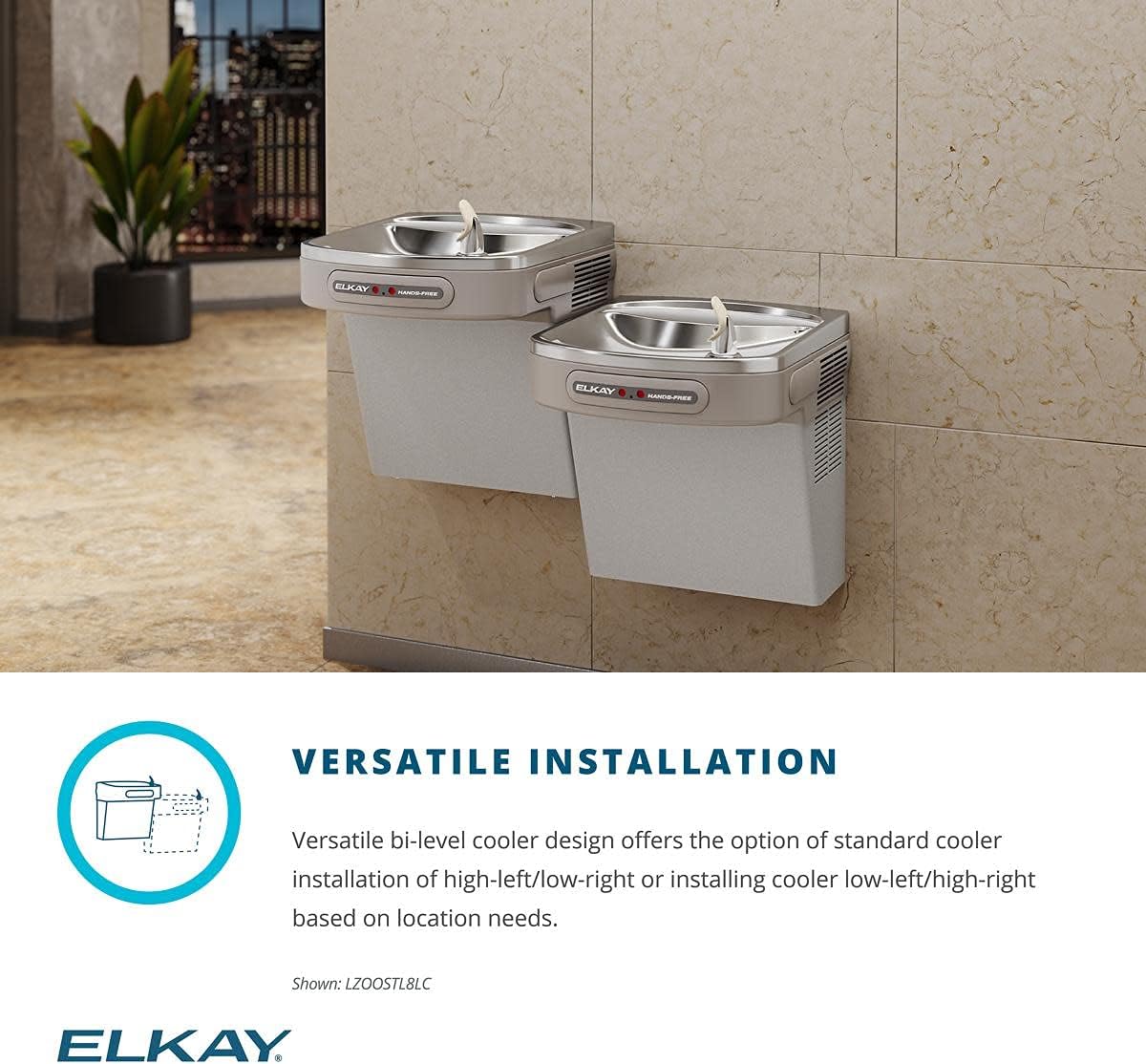 The Elkay EZ models are our most popular water cooler series. The space saving ADA compliant design meets adult or child standards when properly installed. NEW Versatile bi-level design allows for standard high-left/low-right or alternate low-left/high-right installation.
