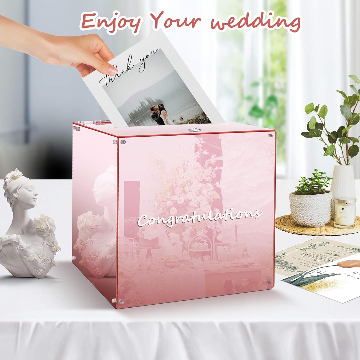 Make your wedding day even more special with our Elegant Wedding Card Box. This beautifully crafted box is the perfect addition to your reception, providing a secure and stylish place for your guests to deposit their well-wishes and cards. Why Choose this beautiful Wedding Card Box? Modern Design: This beautiful box adds a modern and romanctic touch to your special occasion. Large size: the wedding box measures at 12 x 12 x 12 inches and is big enought to hold more than 200-250 cards or envelopes. Secure: The wedding box comes with a sturdy lock which ensures the envelops are secured throughout the celebration.