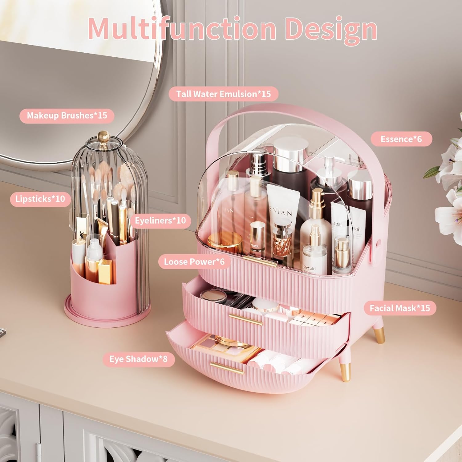 Makeup Organizers Countertop, Makeup organization for Vanity, Cosmetic Storage with Lid and Drawers, Skincare Display Cases with for Desktop, Bathroom (Pink)