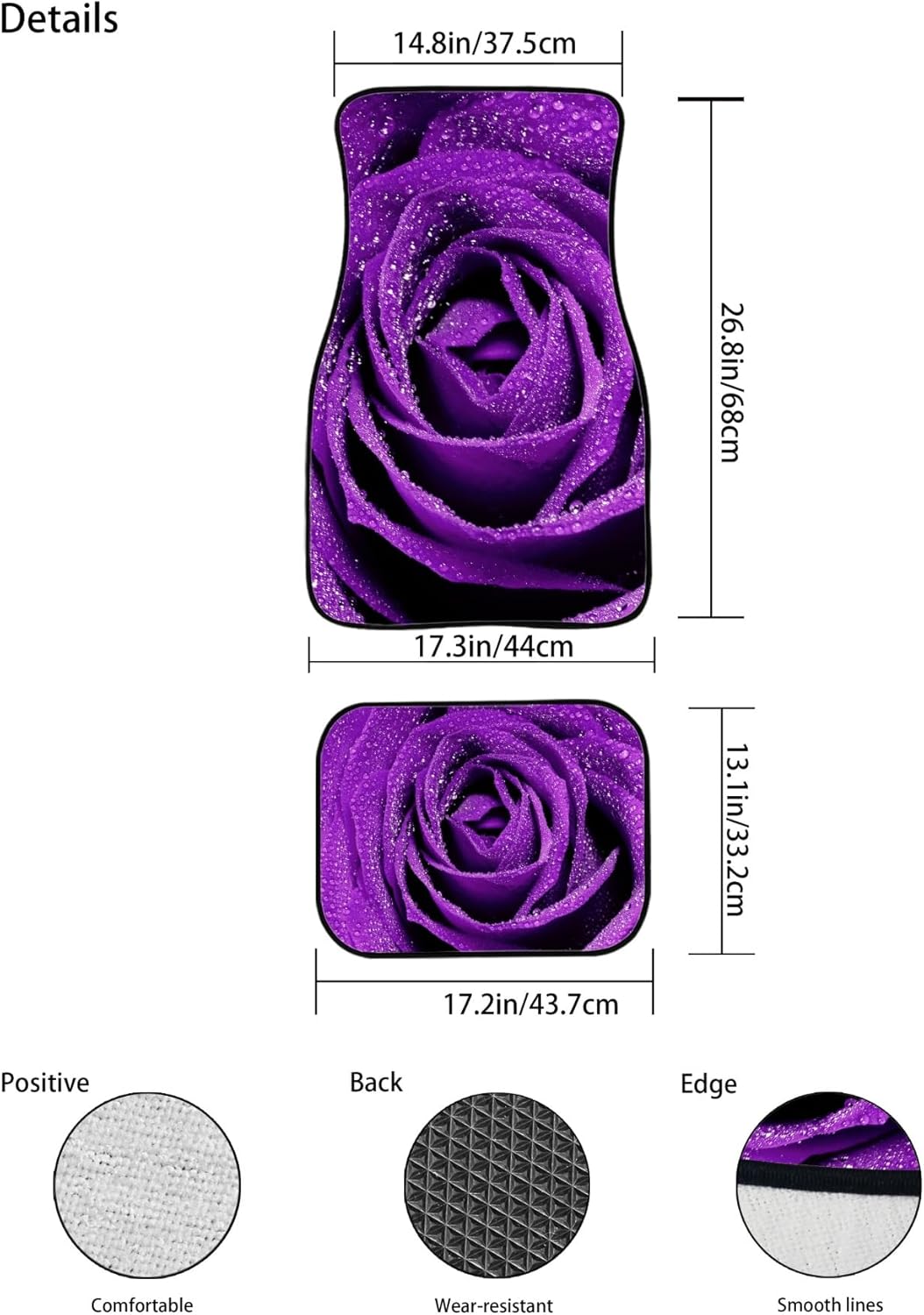 STYLISH CUSTOM CAR ACCESSORIESPRODUCT FEATURES:* Package items: 2 front mats + 2 rear mats* Size: Front mats 14.8” x 26.8” x 17.3” (37.5 x 68 x 44 cm); Rear mats 17.2” x 13.1” (43.7 x 33.2 cm)* Material: Polyester on top and non-slip rubber backing, heavy-duty, washable and practical* Design: Vibrant colors and personalized patterns can meet your visual enjoyment* Function: Shield the interior floor of your vehicle from dirty and spills, add a new stylish look for your vehicle, reinvent your interior style and show your unique personality* Installation: Place the mats on the floor of your vehicle, easy to install and remove* Application: Universal fit for all seasons and great choice for car lovers and new car owners* Washing: Easy to clean, just vacuum or rinse off dirt, mud and spills with waterWARNING:* Due to manual measurement, there may be 1~2cm error in size, please check it carefully before purchasing* Due to transportation requirements, the product is rolled and packaged, please spread it out flat when you receive the product