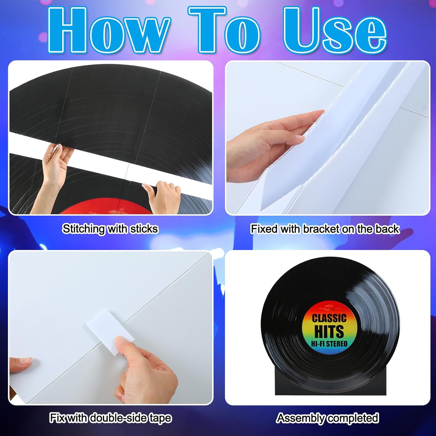 Features: Easy to set up and store: Our vinyl record party decorations are reinforced with 26 plastic patches to prevent folding damage, ensuring a smooth, professional look all night long. Self-adhesive ground spikes and connecting rods ensure stability. Removable design, can be folded flat for convenient compact storage and reuse. As a gift: This 50s 70s music themed party standup decoration set is also a wonderful gift for friends, colleagues, family, whether it is placed indoors or outdoors, it can make the place full of fashion and instantly create a nostalgic1950s records atmosphere, which is loved by everyone. Specifications: Material: PVC, plastic Color: black Size: 44 inches/ 3.7 ft Package Includes: 1 x Vinyl record cardboard cutout stand-up Notes: Manual measurement, please allow slight errors on size. The color may exist a slight difference due to different screen displays. Small parts included, please keep them away from little to avoid swallowing risk