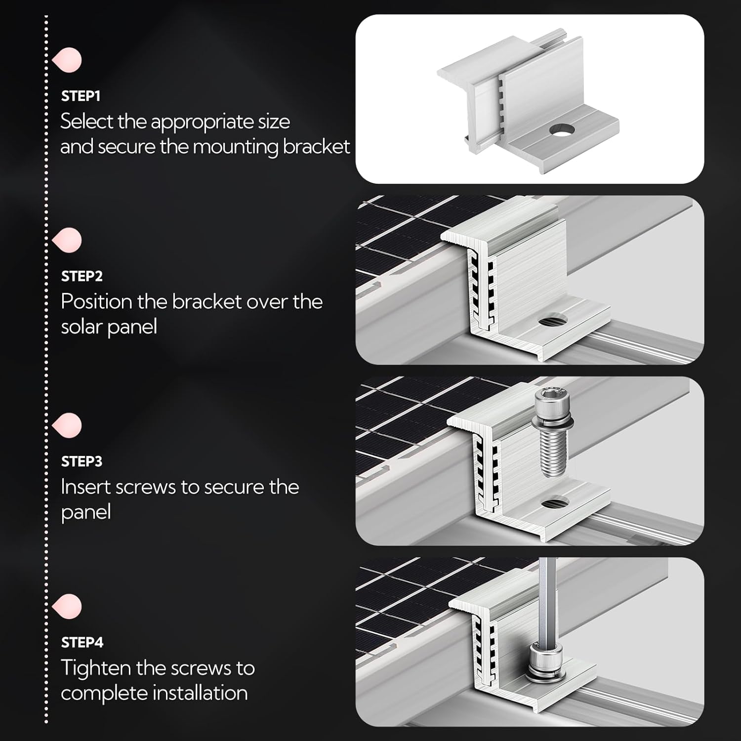 Product InformationName: Adjustable Solar Terminal ClampSize: Adjustable range 35/40/45/50/55 mmMaterial: Aluminum alloyColor: SilverFeatures:- Made from high-strength, corrosion-resistant aluminum alloy- Masterfully crafted with a smooth, burr-free surface. Simple to install and convenient to use- Adjustable Aluminum Z-Bracket for RV and Roof Solar Panel Installation