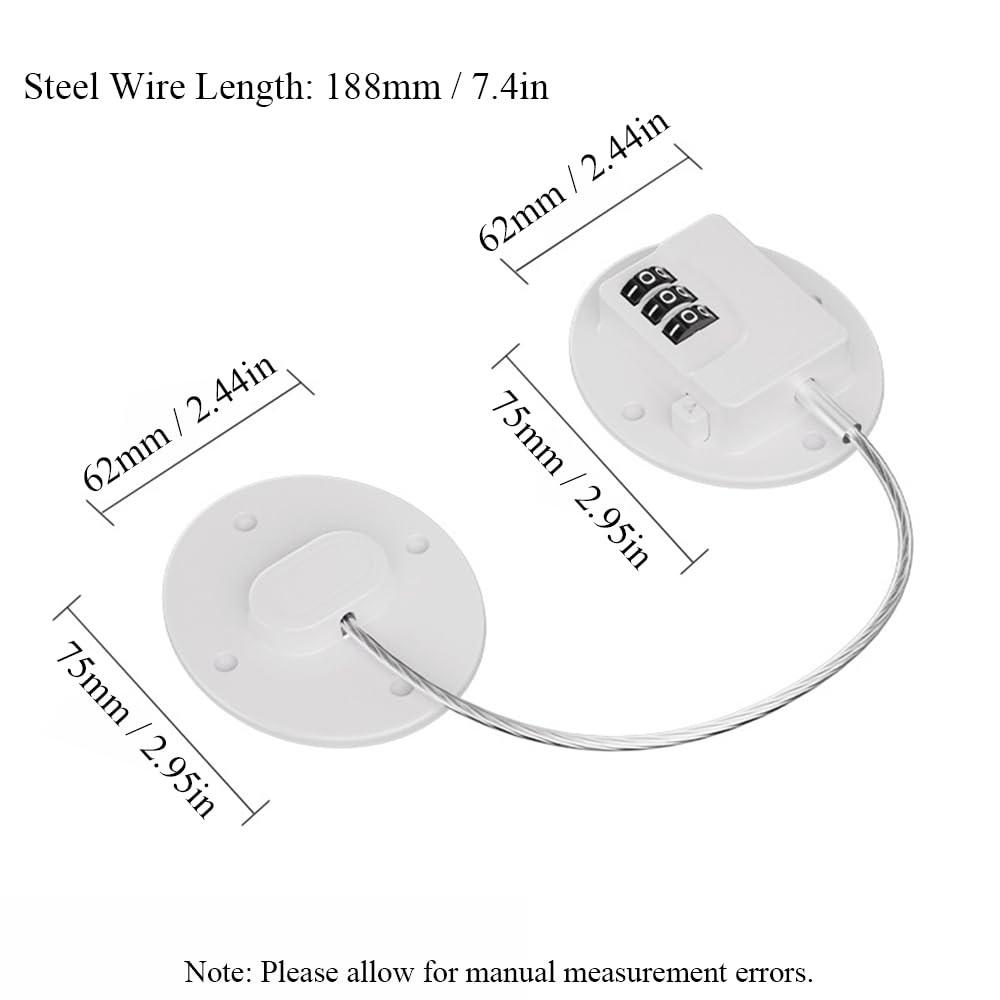 Feature: 【Plastic Material】The safety lock is made of plastic, and its impact resistance helps withstand collisions that may occur during daily use. This material has a certain adaptability to temperature changes, maintaining its shape and function under common environmental conditions to provide continuous protection for items.【Strong Adhesion】The refrigerator lock comes with back adhesive, which remains secure after installation and is not prone to loosening. To ensure optimal adhesion, please clean the surface thoroughly before application to remove any oil or dust, thereby ensuring the initial bonding strength of the adhesive. After installation, we recommend letting it sit for 24 hours, as this effectively enhances the final strength of the adhesive, resulting in a more secure installation.【Sturdy Steel Wire】The cabinet lock body is connected by a steel wire with good tensile resistance. This design makes it less likely to break under general external pulling forces, providing a reliable physical connection. This enhances overall anti-theft and protective performance, meeting fixing needs in various scenarios.【Security Protection】The combination lock features a three-digit combination lock design, eliminating the need to carry or search for a key. It can be quickly opened by entering the preset correct password, making operation relatively simple. The default factory setting for the password is 000, and you can change the password combination as needed to achieve personalized security management.【Wide Applicability】The design of this door lock takes into account diverse usage environments. In addition to being effectively used on refrigerators, it can also serve as an alternative for cabinet locks, oven locks, or toolbox locks. Its structural design is highly compatible with common double-door refrigerator styles and various types of drawers, making it a versatile solution for organizing home security.Specification:Name: Safety LockMaterial: PlasticSize: 62*75mm / 2.44*2.95inSteel Wire Length: 188mm / 7.4inColor: White, Black(Optional)Package Included:2 * Safety Lock