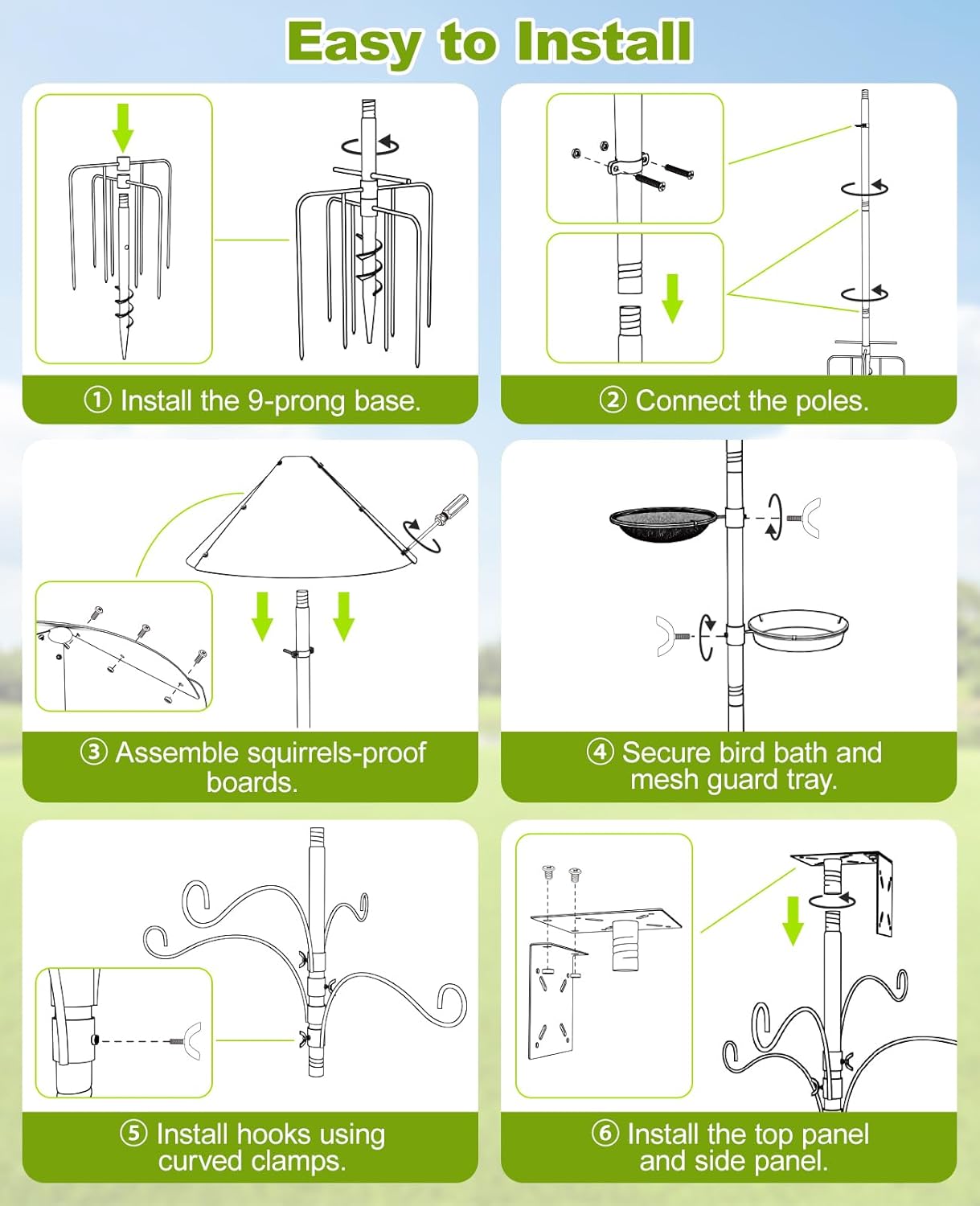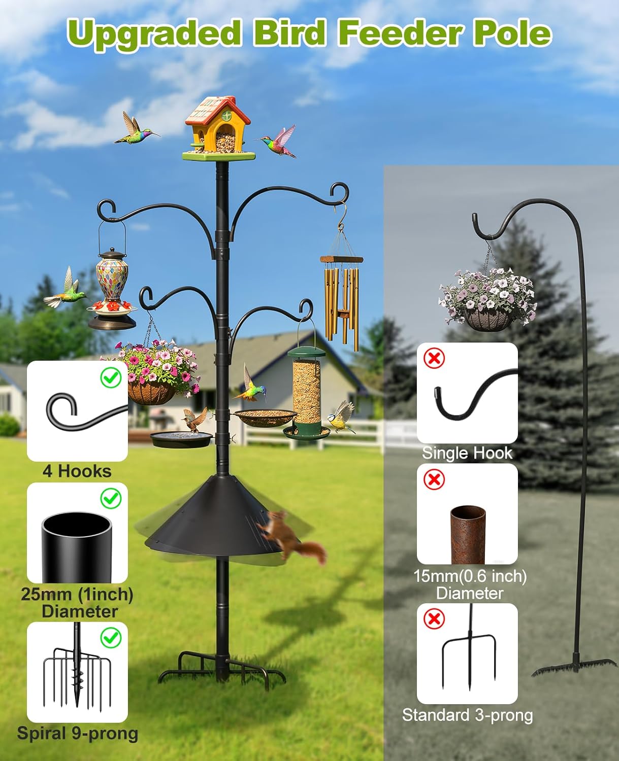 | Included Components | Heavy Duty Hooks (4pcs), 16.5" Squirrel Baffle (1pc), Birdhouse Bracket (1pc), Metal Tray & Mesh Tray (1 set) |