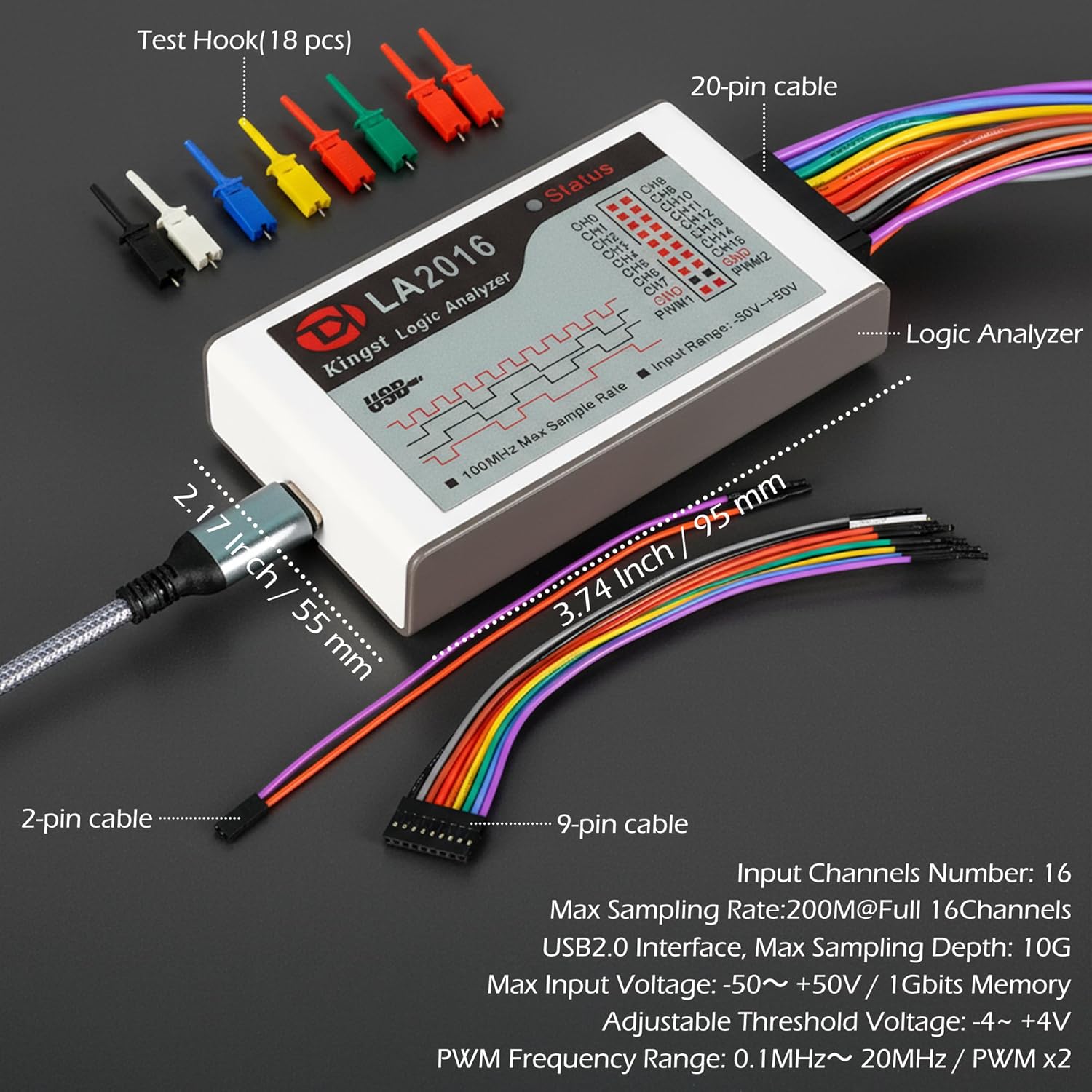 Unlock powerful digital signal analysis with the LA2016 USB Logic Analyzer. Perfect for engineers, hobbyists, and developers working on embedded systems, the LA2016 Logic Analyzer delivers accurate waveform observation and protocol decoding for a wide range of applications.Supported OS:Windows XP, Vista, Windows 7/8/10 (32bit/64bit), Mac OS, LinuxSupported Standard Protocols:UART/RS-232/485, I2C, SPI, CAN, DMX512, HDMI CEC, 12S/PCM, JTAG, LIN, Manchester, Modbus, 1-Wire, UNI/0, SDIO, SMBus, USB1.1, PS/2, NEC InfraRed, Parallel, to be updated from time to timeSPECIFICATIONModel: LA2016Channels: 16 input channels (2 PWM channels included)Sampling Rate: 200M@FULL 16CHMax. Sampling Depth: 10G, USB2.0 Interface (actual depth may be limited by the PC’s memory capacity)Adjustable Threshold: -4V to +4V, step: 0.01VInput voltage range -50V to +50VMeasuring Bandwidth: 40MMin pulse width captured: 12.5nsHardware memory size: 1GbitsHardware sampling depth: 50M/channelMax compressed depth : 10G/channelPWM Frequency Range: 0.1MHz to 20MHz, step: 10nsPWM Output Voltage: +3.3VPWM Output Impedance: 50ΩStandby Current: 150mAMax. Operating Current: 300mADimensions: 3.74*2.17*0.71in / 95*55*18mmPACKAGE1 x LA2016 Logic Analyzer3 x 9P Test Set2 x 2P Test Set20 x Test Hook Clip1 x USB-C Cable with USB-A Adapter1 x Storage Case1 x Manual
