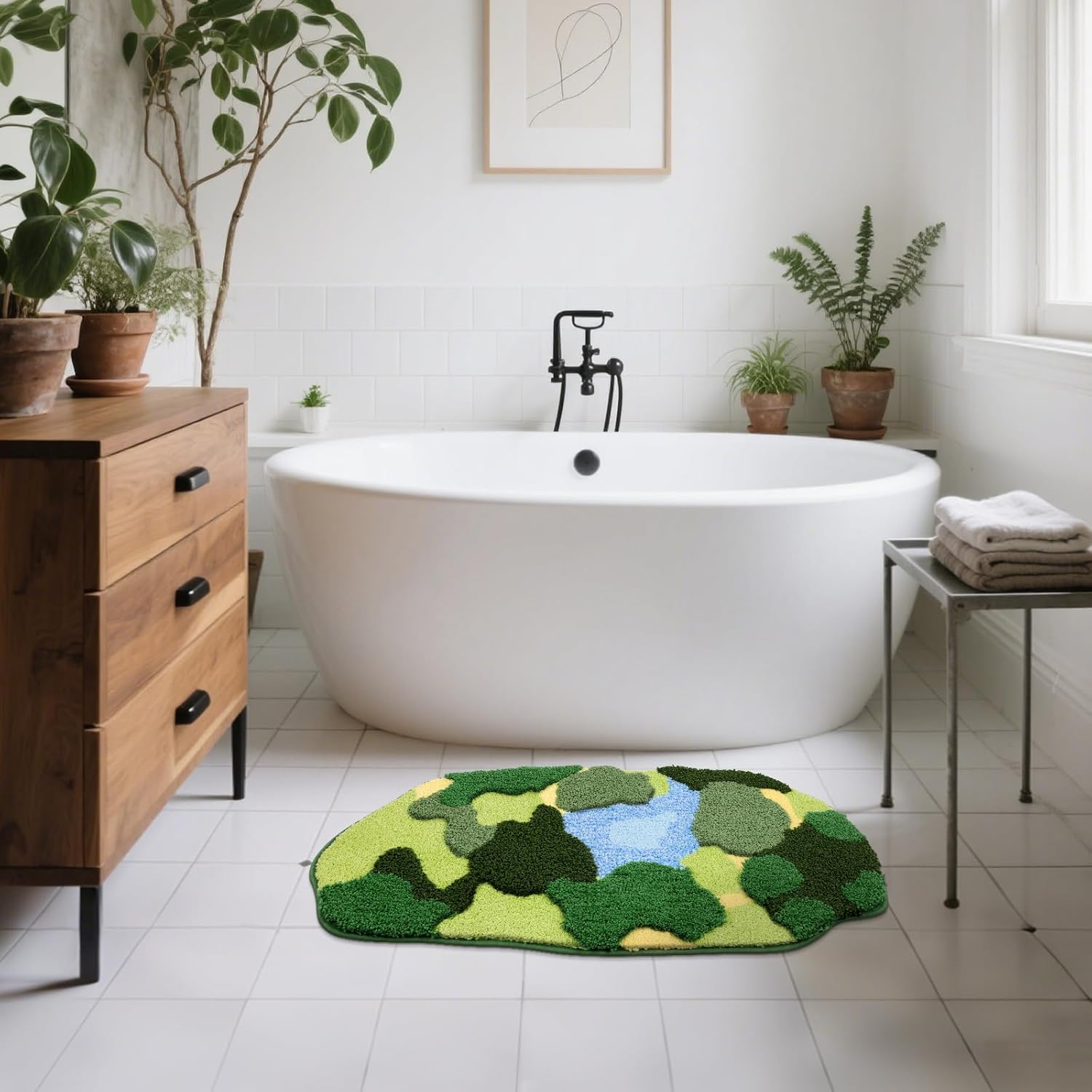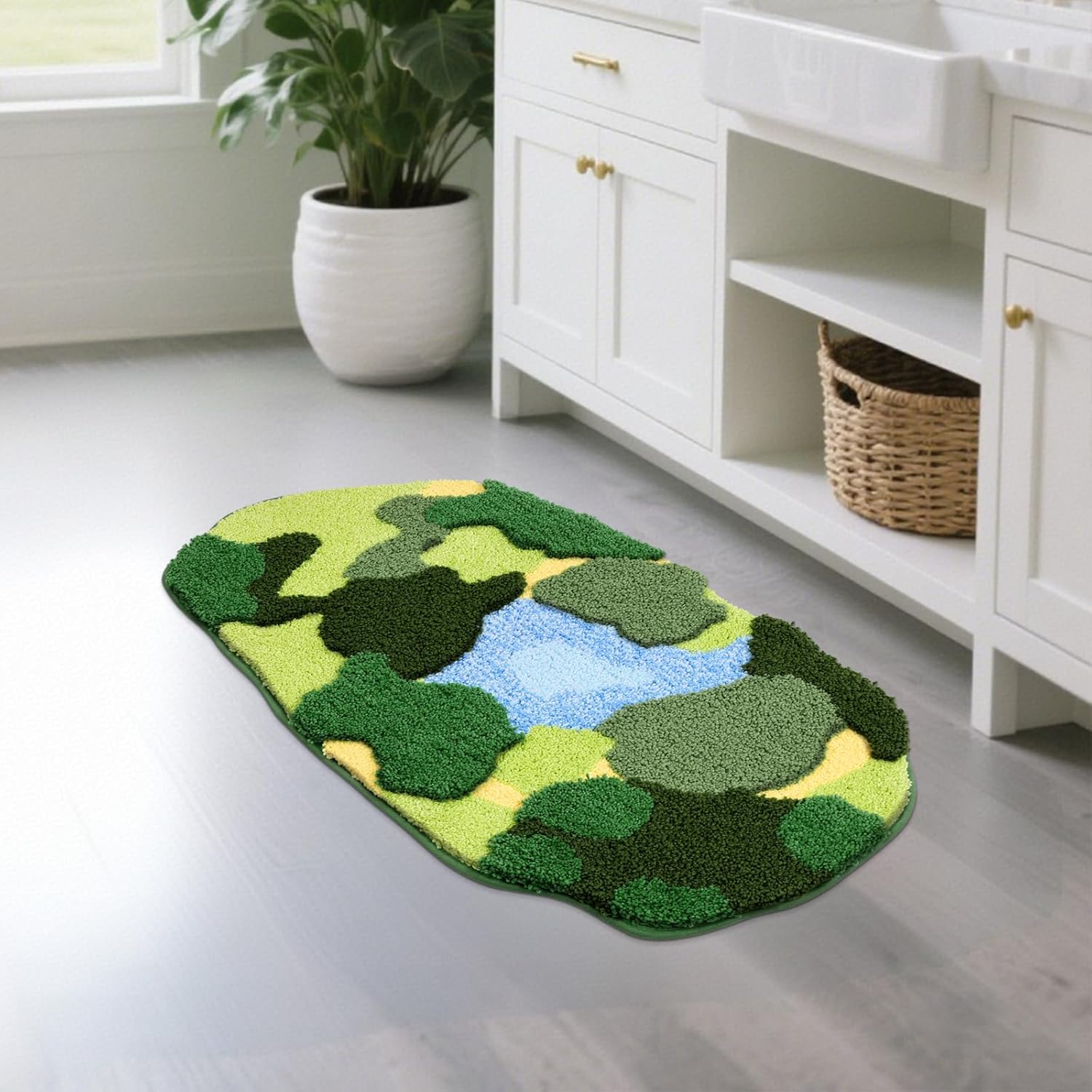 • SHACOS green moss rug reminds you of the natural fresh forest moss landscape, soft plush to touch, multicolored green shades in different heights of piles, decorated with a small pond of ombre blue water. The moss rug adds fun and natural look to your place. What a pretty bathmat!