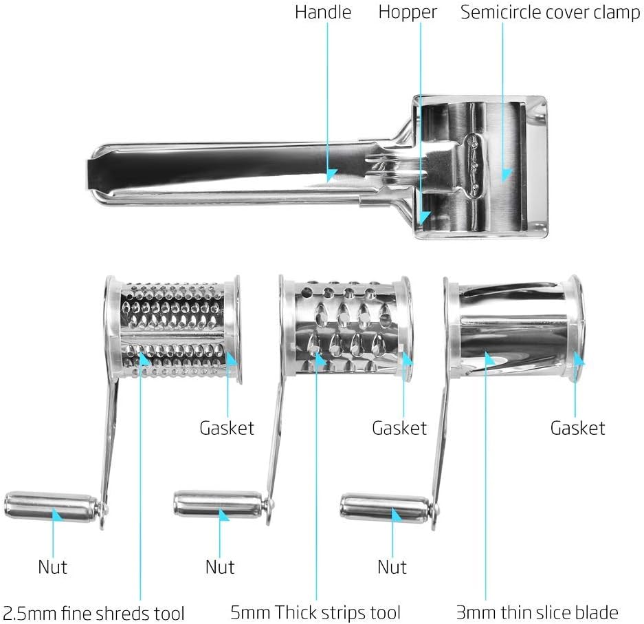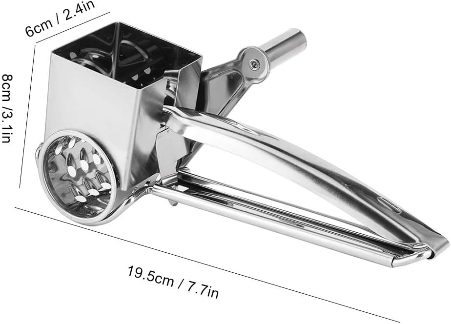 Feature:1. 3 different rotatable drums stainless steel blades for all types, you can interchange for either fine grating or coarser grating of your ingredients.2. Easy to use, simply insert food into the feeder and turn handle to grate or shred. With a few light taps the excess cheese should be freed and , cheese to cook!3. This is great item for soft or hard cheese, chocolate, nuts, parmesan, pistachio, almonds and more! It can also be used as a zester and .4. Made of food grade stainless steel, easy to , dishwasher .5. Easy to store, handle enables grater to be hung, fits in small cabinets, and remains out of the way removing clutter from your kitchen. Specification:Condition: Brand NewItem Type: Cheese GraterMaterial: Stainless Steel Color: As shown in the pictureSize: Approx. 19.5x6x8cm / 7.7x2.4x3.1in Weight: Approx.378g/13.3ozPackage List:1 x Grater Body1 x Slicing Tool1 x Powder Tool1 x Grating ToolNote:1. Please allow 13cm error due to manual measurement. Thanks for your understanding.2. Monitors are not calibrated same, item color displayed in photos may be showing slightly different from the real object. Please take the real one as standard.