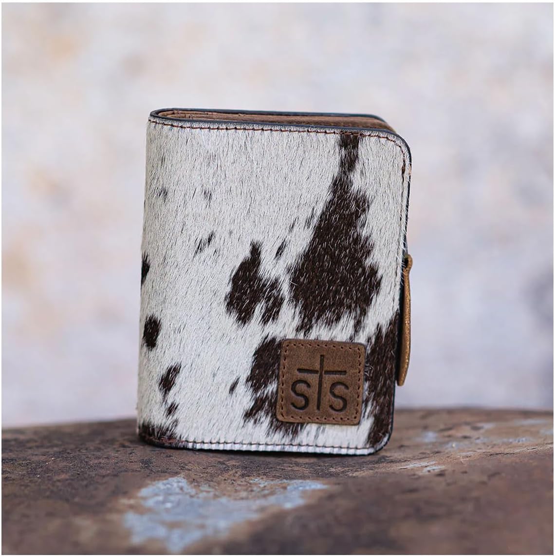 STS Genuine full grain leather Genuine CowhideZip closureCard slotsID slotCash slip pocket1 interior zip coin pocket3.5” W x 4.5” H x 1” DSTS60378Complement any look with a touch of Western flair with the Cowhide Soni Wallet from STS Ranchwear.